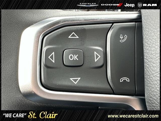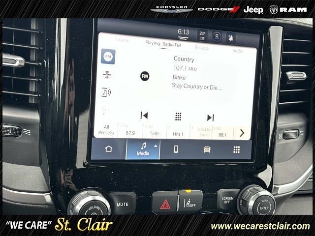 115V Auxiliary Power Outlet, 2nd Row In Floor Storage Bins, 3 Rear Seat Head Restraints, 4 Way Front Headrests, 4-Wheel Disc Brakes, 400W Inverter, 4G LTE Wi-Fi Hot Spot, 6 Speakers, ABS brakes, Accent Color Door Handles, Accent Color Premium Power Mirrors, Accent Color Tailgate Handle, Air Conditioning, Alloy wheels, AM/FM radio, Anti-Spin Differential Rear Axle, Apple CarPlay/Android Auto, Auto High-beam Headlights, Auto Power-Folding Mirrors, Auto-Dimming Exterior Driver Mirror, Auto-Dimming Rear-View Mirror, Big Horn Badge, Big Horn Level 1 Equipment Group, Black Exterior Mirrors, Black Exterior Truck Badging, Black Headlamp Bezels, Black Interior Accents, Black Painted Exterior Mirrors Caps, Black Premium Power Mirrors, Black Tail Lamp Bezels, Body Color Front Bumper, Body Color Rear Bumper w/Step Pads, Brake assist, Bucket Seats, Bumpers: chrome, Cloth Bench Seat, Compass, Connectivity - US/Canada, Convex Wide-Angle Exterior Mirror Insert, Delay-off headlights, Deluxe Cloth Bucket Seats, Driver door bin, Dual front impact airbags, Dual front side impact airbags, Electronic Stability Control, Exterior Mirrors Courtesy Lamps, Exterior Mirrors w/Heating Element, Exterior Mirrors w/Supplemental Signals, Front anti-roll bar, Front Center Armrest w/Storage, Front fog lights, Front reading lights, Front Seat Back Map Pockets, Front wheel independent suspension, Full Length Floor Console, Fully automatic headlights, Glove Box Lamp, GPS Antenna Input, Grille Black Surround Black Mesh, Heated door mirrors, Heated Front Seats, Heated Steering Wheel, Illuminated entry, Integrated Voice Command w/Bluetooth®, Leather Wrapped Steering Wheel, Low tire pressure warning, Manual Adjust 4-Way Front Passenger Seat, Manual Folding Exterior Mirrors, Manufacturer's Statement of Origin, Night Edition, Occupant sensing airbag, Outside temperature display, Overhead airbag, Overhead console, Panic alarm, ParkView Rear Back-Up Camera, Passenger door bin, Passenger vanity mirror, Power 2-Way Driver Lumbar Adjust, Power Adjust 8-Way Driver Seat, Power Adjustable Pedals, Power door mirrors, Power steering, Power windows, Quick Order Package 23Z Big Horn, Radio data system, Radio: Uconnect 5 W w/8.4 Display, RAM Grille Badge - Black, RAM Grille Badge - Chrome, Rear 60/40 Folding Seat, Rear anti-roll bar, Rear Center Armrest, Rear Power Sliding Window, Rear seat center armrest, Rear step bumper, Rear Window Defroster, Remote keyless entry, Speed control, Split folding rear seat, Steering Wheel Mounted Audio Controls, Sun Visors w/Illuminated Vanity Mirrors, Supplier Part Tracking (J-1), Tachometer, Telescoping steering wheel, Tilt steering wheel, Traction control, Trip computer, Universal Garage Door Opener, USB Host Flip, Variably intermittent wipers, Voltmeter, Wheels: 18 x 8 Cast-Aluminum Painted, Wheels: 20 x 9.0 Aluminum Painted Clad.