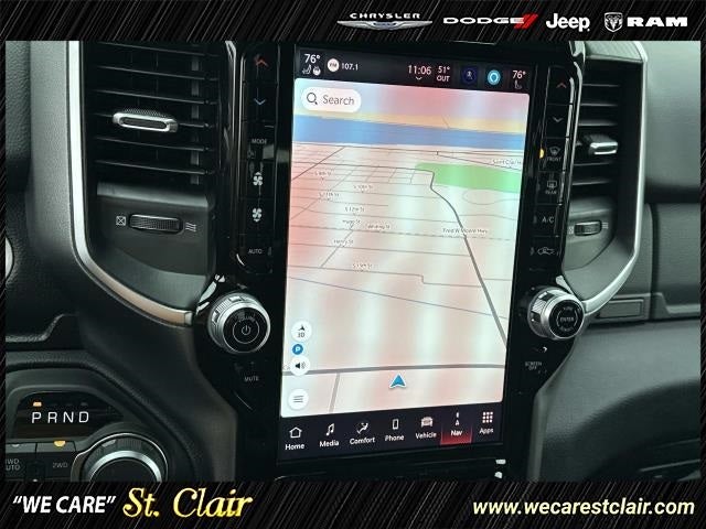 115V Auxiliary Power Outlet, 115V Auxiliary Rear Power Outlet, 12 Touchscreen Display, 2nd Row in Floor Storage Bins, 3 Rear Seat Head Restraints, 4 Way Front Headrests, 4-Wheel Disc Brakes, 400W Inverter, 48V Belt Starter Generator, 4G LTE Wi-Fi Hot Spot, 6 Speakers, 9 Amplified Speakers with Subwoofer, ABS brakes, Accent Color Door Handles, Accent Color Premium Power Mirrors, Accent Color Tailgate Handle, Air Conditioning, Air Conditioning ATC with Dual Zone Control, Alloy wheels, AM/FM radio, Anti-Spin Differential Rear Axle, Apple CarPlay, Apple CarPlay/Android Auto, Auto High-beam Headlights, Auto Power-Folding Mirrors, Auto-Dimming Exterior Driver Mirror, Auto-Dimming Rear-View Mirror, Big Horn Level 2 Equipment Group, Black Exterior Mirrors, Black Exterior Truck Badging, Black Headlamp Bezels, Black Interior Accents, Black Painted Exterior Mirrors Caps, Black Premium Power Mirrors, Black Tail Lamp Bezels, Body Color Fender Flares, Body Color Front Bumper, Body Color Rear Bumper with Step Pads, Brake assist, Bucket Seats, Bumpers: chrome, Center Console Parts Module, Cloth Bucket Seats, Cluster 7.0 TFT Color Display, Compass, Configurable Drive Mode, Connected Travel and Traffic Services, Connectivity - US/Canada, Convex Wide-Angle Exterior Mirror Insert, Delay-off headlights, Deluxe Cloth Bucket Seats, Disassociated Touchscreen Display, Driver door bin, Dual Exhaust with Black Tips, Dual front impact airbags, Dual front side impact airbags, Electronic Stability Control, Exterior Mirrors Courtesy Lamps, Exterior Mirrors with Heating Element, Exterior Mirrors with Supplemental Signals, Front anti-roll bar, Front Bucket Seats, Front Center Armrest w/Storage, Front fog lights, Front reading lights, Front Seat Back Map Pockets, Front wheel independent suspension, Full Length Floor Console, Fully automatic headlights, Global Telematics Box Module, Glove Box Lamp, Google Android Auto, GPS Antenna Input, GPS Navigation, Grille Black Surround Black Mesh, HD Radio, Heated door mirrors, Heated Front Seats, Heated Steering Wheel, Illuminated entry, Integrated Center Stack Radio, Integrated Voice Command with Bluetooth®, Leather Wrapped Steering Wheel, LED Dome Lamp with on/Off Switch, LED Footwell Lighting, Low tire pressure warning, Manual Adjust 4-Way Driver Seat, Manual Adjust 4-Way Front Passenger Seat, Manual Folding Exterior Mirrors, Manufacturer's Statement of Origin, Media Hub with 2 Charge Only USBs, Night Edition, Occupant sensing airbag, Outside temperature display, Overhead airbag, Overhead console, Overhead LED Lamps, Panic alarm, ParkView Rear Back-Up Camera, Passenger door bin, Passenger vanity mirror, Power 2-Way Driver Lumbar Adjust, Power Adjust 8-Way Driver Seat, Power Adjustable Pedals, Power door mirrors, Power steering, Power windows, Premium Overhead Console, Quick Order Package 21Z Big Horn, Radio data system, Radio: Uconnect 5 Navigation with 12.0 Display, Radio: Uconnect 5 W with 8.4 Display, RAM Grille Badge - Black, RAM Grille Badge - Chrome, Rear 60/40 Folding Seat, Rear anti-roll bar, Rear Center Armrest, Rear Power Sliding Window, Rear step bumper, Rear Wheelhouse Liners, Rear Window Defroster, Remote keyless entry, Remote Tailgate Release, Security Alarm, SiriusXM Radio Service, SiriusXM with 360L, Speed control, Steering Wheel Mounted Audio Controls, Sun Visors with Illuminated Vanity Mirrors, Supplier Part Tracking (J-1), Tachometer, Telescoping steering wheel, Tilt steering wheel, Traction control, Trip computer, Universal Garage Door Opener, USB Host Flip, Variably intermittent wipers, Voltmeter, Wheels: 20 x 9.0 Aluminum Painted Clad.
