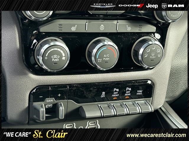 115V Auxiliary Power Outlet, 2nd Row in Floor Storage Bins, 3 Rear Seat Head Restraints, 33 Gallon Fuel Tank, 4 Way Front Headrests, 4-Wheel Disc Brakes, 400W Inverter, 48V Belt Starter Generator, 4G LTE Wi-Fi Hot Spot, 6 Speakers, ABS brakes, Accent Color Door Handles, Accent Color Premium Power Mirrors, Accent Color Tailgate Handle, Air Conditioning, Alloy wheels, AM/FM radio, Anti-Spin Differential Rear Axle, Apple CarPlay, Apple CarPlay/Android Auto, Auto High-beam Headlights, Auto Power-Folding Mirrors, Auto-Dimming Exterior Driver Mirror, Auto-Dimming Rear-View Mirror, Big Horn Level 1 Equipment Group, Black Exterior Mirrors, Black Exterior Truck Badging, Black Headlamp Bezels, Black Interior Accents, Black Painted Exterior Mirrors Caps, Black Premium Power Mirrors, Black Tail Lamp Bezels, Body Color Fender Flares, Body Color Front Bumper, Body Color Rear Bumper with Step Pads, Brake assist, Bucket Seats, Bumpers: chrome, Center Console Parts Module, Cloth Bucket Seats, Compass, Connectivity - US/Canada, Convex Wide-Angle Exterior Mirror Insert, Delay-off headlights, Deluxe Cloth Bucket Seats, Driver door bin, Dual Exhaust with Black Tips, Dual front impact airbags, Dual front side impact airbags, Electronic Stability Control, Exterior Mirrors Courtesy Lamps, Exterior Mirrors with Heating Element, Exterior Mirrors with Supplemental Signals, Front anti-roll bar, Front Bucket Seats, Front Center Armrest w/Storage, Front fog lights, Front reading lights, Front Seat Back Map Pockets, Front wheel independent suspension, Full Length Floor Console, Fully automatic headlights, Global Telematics Box Module, Glove Box Lamp, Google Android Auto, GPS Antenna Input, Grille Black Surround Black Mesh, Heated door mirrors, Heated Front Seats, Heated Steering Wheel, Illuminated entry, Integrated Center Stack Radio, Integrated Voice Command with Bluetooth®, Leather Wrapped Steering Wheel, Low tire pressure warning, Manual Adjust 4-Way Driver Seat, Manual Adjust 4-Way Front Passenger Seat, Manual Folding Exterior Mirrors, Manufacturer's Statement of Origin, MyFlexCare Service Plan, Night Edition, Occupant sensing airbag, Outside temperature display, Overhead airbag, Overhead console, Panic alarm, ParkView Rear Back-Up Camera, Passenger door bin, Passenger vanity mirror, Power 2-Way Driver Lumbar Adjust, Power Adjust 8-Way Driver Seat, Power Adjustable Pedals, Power door mirrors, Power steering, Power windows, Quick Order Package 27Z Big Horn, Radio data system, Radio: Uconnect 5 W with 8.4 Display, RAM Grille Badge - Black, RAM Grille Badge - Chrome, Rear 60/40 Folding Seat, Rear anti-roll bar, Rear Center Armrest, Rear Dome with on/Off Switch Lamp, Rear Power Sliding Window, Rear step bumper, Rear Wheelhouse Liners, Rear Window Defroster, Remote keyless entry, SiriusXM Radio Service, SiriusXM Satellite Radio, Speed control, Steering Wheel Mounted Audio Controls, Sun Visors with Illuminated Vanity Mirrors, Supplier Part Tracking (J-1), Tachometer, Telescoping steering wheel, Tilt steering wheel, Traction control, Trailer Brake Control, Trip computer, Universal Garage Door Opener, USB Host Flip, Variably intermittent wipers, Voltmeter, Wheels: 20 x 9.0 Aluminum Painted Clad.
