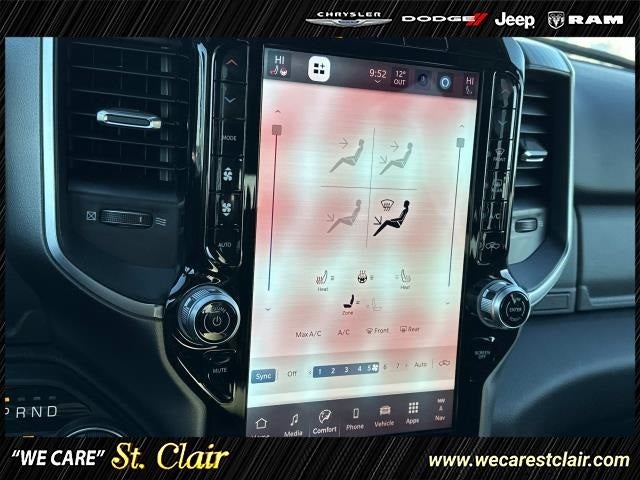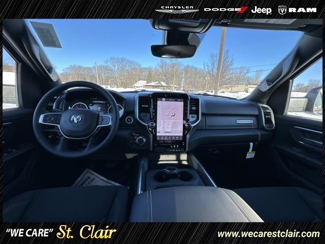 115V Auxiliary Power Outlet, 115V Auxiliary Rear Power Outlet, 12 Touchscreen Display, 2nd Row in Floor Storage Bins, 3 Rear Seat Head Restraints, 4 Way Front Headrests, 4-Wheel Disc Brakes, 400W Inverter, 48V Belt Starter Generator, 4G LTE Wi-Fi Hot Spot, 6 Speakers, 9 Amplified Speakers with Subwoofer, ABS brakes, Accent Color Door Handles, Accent Color Premium Power Mirrors, Accent Color Tailgate Handle, Air Conditioning, Air Conditioning ATC with Dual Zone Control, Alloy wheels, AM/FM radio, Anti-Spin Differential Rear Axle, Apple CarPlay, Apple CarPlay/Android Auto, Auto High-beam Headlights, Auto Power-Folding Mirrors, Auto-Dimming Exterior Driver Mirror, Auto-Dimming Rear-View Mirror, Big Horn Level 2 Equipment Group, Black Exterior Mirrors, Black Exterior Truck Badging, Black Headlamp Bezels, Black Interior Accents, Black Painted Exterior Mirrors Caps, Black Premium Power Mirrors, Black Tail Lamp Bezels, Body Color Fender Flares, Body Color Front Bumper, Body Color Rear Bumper with Step Pads, Brake assist, Bucket Seats, Bumpers: chrome, Center Console Parts Module, Cloth Bucket Seats, Cluster 7.0 TFT Color Display, Compass, Configurable Drive Mode, Connected Travel and Traffic Services, Connectivity - US/Canada, Convex Wide-Angle Exterior Mirror Insert, Delay-off headlights, Deluxe Cloth Bucket Seats, Disassociated Touchscreen Display, Driver door bin, Dual Exhaust with Black Tips, Dual front impact airbags, Dual front side impact airbags, Electronic Stability Control, Exterior Mirrors Courtesy Lamps, Exterior Mirrors with Heating Element, Exterior Mirrors with Supplemental Signals, Front anti-roll bar, Front Bucket Seats, Front Center Armrest w/Storage, Front fog lights, Front reading lights, Front Seat Back Map Pockets, Front wheel independent suspension, Full Length Floor Console, Fully automatic headlights, Global Telematics Box Module, Glove Box Lamp, Google Android Auto, GPS Antenna Input, GPS Navigation, Grille Black Surround Black Mesh, HD Radio, Heated door mirrors, Heated Front Seats, Heated Steering Wheel, Illuminated entry, Integrated Center Stack Radio, Integrated Voice Command with Bluetooth®, Leather Wrapped Steering Wheel, LED Dome Lamp with on/Off Switch, LED Footwell Lighting, Low tire pressure warning, Manual Adjust 4-Way Driver Seat, Manual Adjust 4-Way Front Passenger Seat, Manual Folding Exterior Mirrors, Manufacturer's Statement of Origin, Media Hub with 2 Charge Only USBs, MyFlexCare Service Plan, Night Edition, Occupant sensing airbag, Outside temperature display, Overhead airbag, Overhead console, Overhead LED Lamps, Panic alarm, ParkView Rear Back-Up Camera, Passenger door bin, Passenger vanity mirror, Power 2-Way Driver Lumbar Adjust, Power Adjust 8-Way Driver Seat, Power Adjustable Pedals, Power door mirrors, Power steering, Power windows, Premium Overhead Console, Quick Order Package 23Z Big Horn, Radio data system, Radio: Uconnect 5 Navigation with 12.0 Display, Radio: Uconnect 5 W with 8.4 Display, RAM Grille Badge - Black, RAM Grille Badge - Chrome, Rear 60/40 Folding Seat, Rear anti-roll bar, Rear Center Armrest, Rear Power Sliding Window, Rear step bumper, Rear Window Defroster, Remote keyless entry, Remote Tailgate Release, Security Alarm, SiriusXM Radio Service, SiriusXM with 360L, Speed control, Steering Wheel Mounted Audio Controls, Sun Visors with Illuminated Vanity Mirrors, Supplier Part Tracking (J-1), Tachometer, Telescoping steering wheel, Tilt steering wheel, Traction control, Trip computer, Universal Garage Door Opener, USB Host Flip, Variably intermittent wipers, Voltmeter, Wheels: 20 x 9.0 Aluminum Painted Clad.