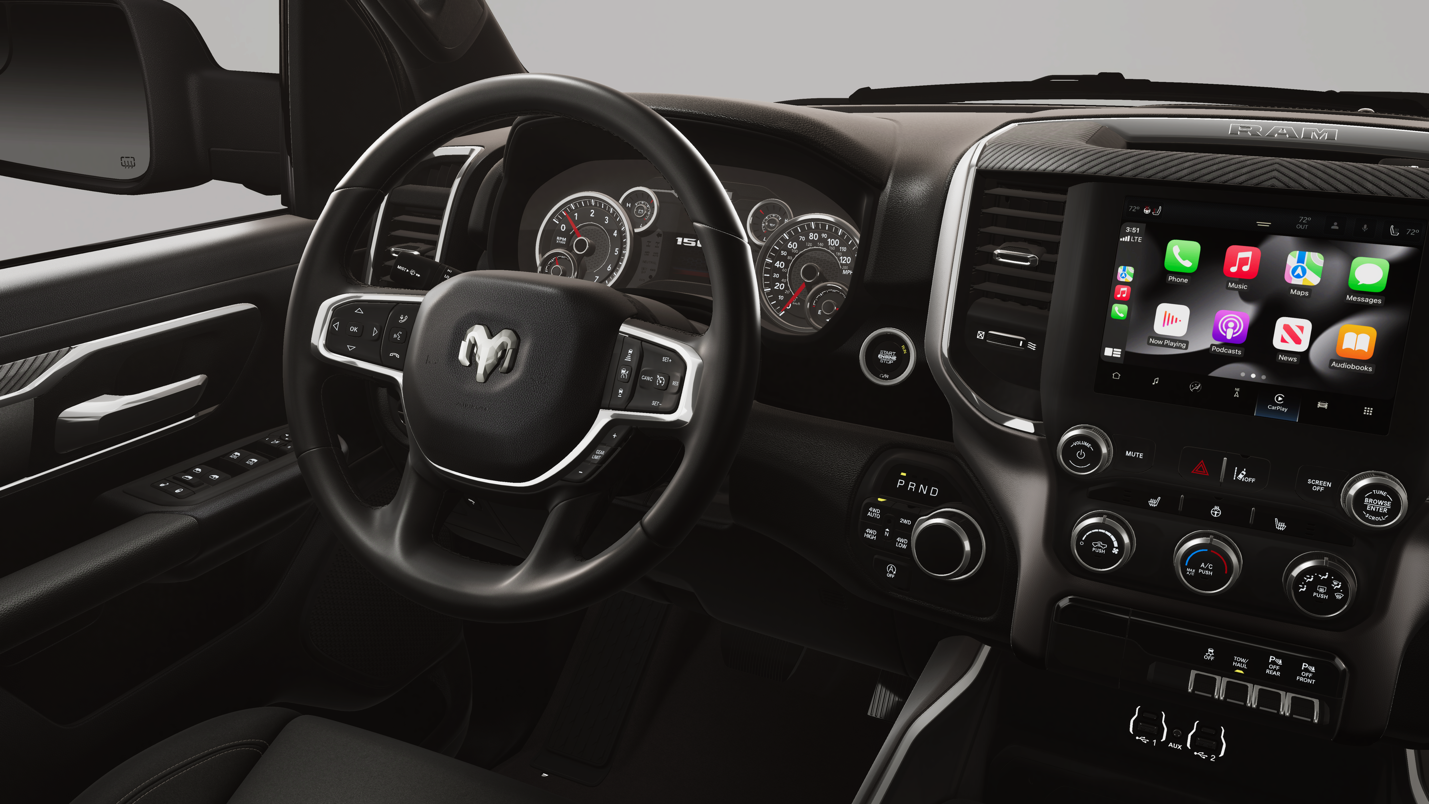 115V Auxiliary Power Outlet, 2nd Row in Floor Storage Bins, 3 Rear Seat Head Restraints, 4 Way Front Headrests, 4-Wheel Disc Brakes, 400W Inverter, 48V Belt Starter Generator, 4G LTE Wi-Fi Hot Spot, 6 Speakers, ABS brakes, Air Conditioning, Alloy wheels, AM/FM radio, Apple CarPlay, Apple CarPlay/Android Auto, Auto High-beam Headlights, Auto Power-Folding Mirrors, Auto-Dimming Exterior Driver Mirror, Auto-Dimming Rear-View Mirror, Big Horn Level 1 Equipment Group, Black Exterior Mirrors, Black Premium Power Mirrors, Body Color Fender Flares, Brake assist, Bucket Seats, Bumpers: chrome, Center Console Parts Module, Cloth Bucket Seats, Compass, Connectivity - US/Canada, Convex Wide-Angle Exterior Mirror Insert, Delay-off headlights, Deluxe Cloth Bucket Seats, Driver door bin, Dual front impact airbags, Dual front side impact airbags, Electronic Stability Control, Exterior Mirrors Courtesy Lamps, Exterior Mirrors with Heating Element, Exterior Mirrors with Supplemental Signals, Front anti-roll bar, Front Bucket Seats, Front Center Armrest w/Storage, Front fog lights, Front reading lights, Front Seat Back Map Pockets, Front wheel independent suspension, Full Length Floor Console, Fully automatic headlights, Global Telematics Box Module, Glove Box Lamp, Google Android Auto, GPS Antenna Input, Heated door mirrors, Heated Front Seats, Heated Steering Wheel, Illuminated entry, Integrated Center Stack Radio, Integrated Voice Command with Bluetooth®, Leather Wrapped Steering Wheel, Low tire pressure warning, Manual Adjust 4-Way Driver Seat, Manual Adjust 4-Way Front Passenger Seat, Manual Folding Exterior Mirrors, Manufacturer's Statement of Origin, MyFlexCare Service Plan, Occupant sensing airbag, Outside temperature display, Overhead airbag, Overhead console, Panic alarm, ParkView Rear Back-Up Camera, Passenger door bin, Passenger vanity mirror, Power 2-Way Driver Lumbar Adjust, Power Adjust 8-Way Driver Seat, Power Adjustable Pedals, Power door mirrors, Power steering, Power windows, Quick Order Package 23Z Big Horn, Radio data system, Radio: Uconnect 5 W with 8.4 Display, RAM Grille Badge - Chrome, Rear 60/40 Folding Seat, Rear anti-roll bar, Rear Center Armrest, Rear Dome with on/Off Switch Lamp, Rear Power Sliding Window, Rear step bumper, Rear Window Defroster, Remote keyless entry, SiriusXM Radio Service, SiriusXM Satellite Radio, Speed control, Steering Wheel Mounted Audio Controls, Sun Visors with Illuminated Vanity Mirrors, Supplier Part Tracking (J-1), Tachometer, Telescoping steering wheel, Tilt steering wheel, Traction control, Trip computer, Universal Garage Door Opener, USB Host Flip, Variably intermittent wipers, Voltmeter, Wheels: 18 x 8 Cast-Aluminum Painted.