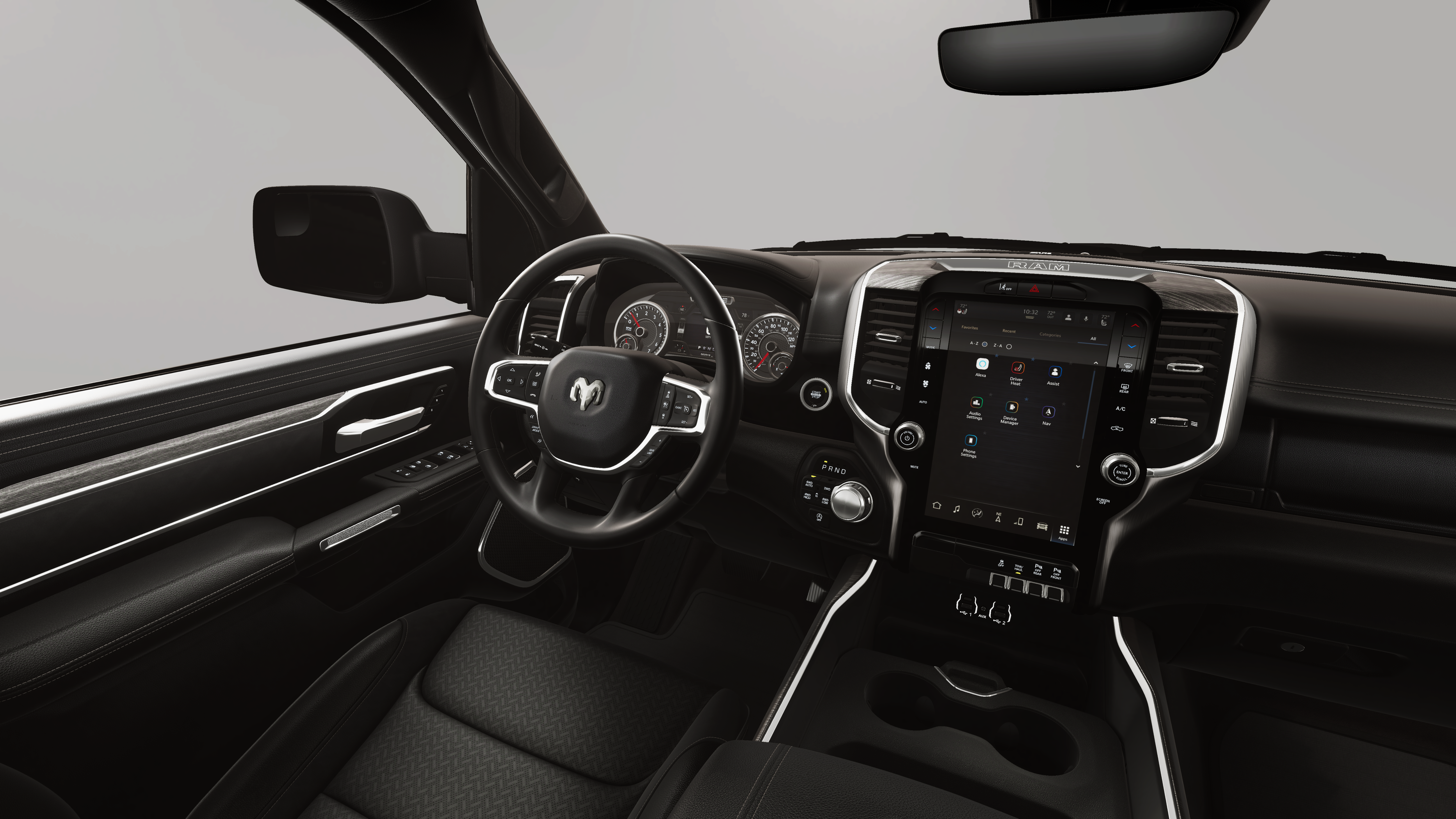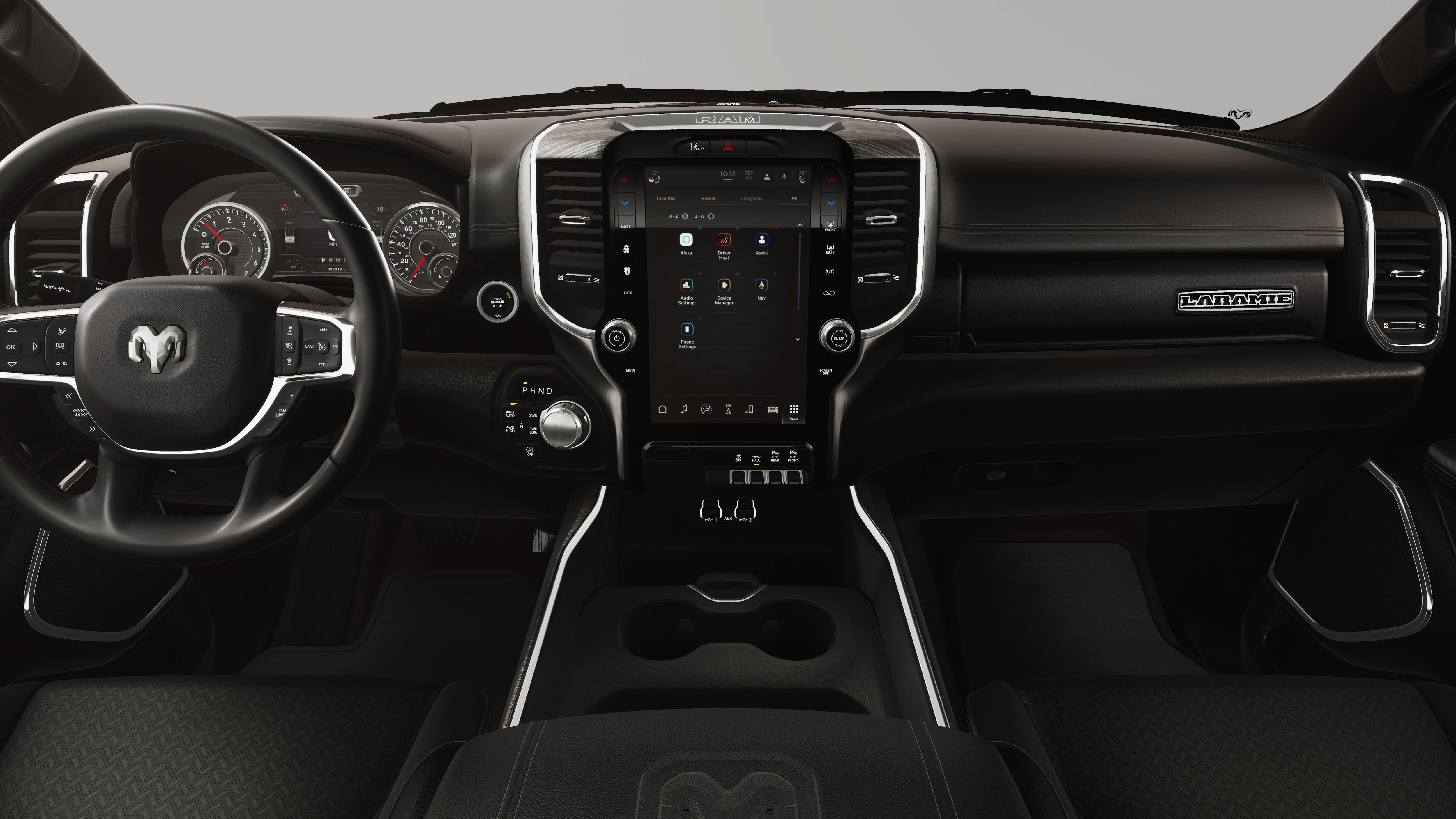10 Speakers, 33 Gallon Fuel Tank, 4-Wheel Disc Brakes, 4G LTE Wi-Fi Hot Spot, ABS brakes, Accent Color Door Handles, Accent Color Premium Power Mirrors, Accent Color Tailgate Handle, Active Noise Control System, Adjustable pedals, Air Conditioning, Alloy wheels, AM/FM radio: SiriusXM with 360L, Anti-Spin Differential Rear Axle, Apple CarPlay/Android Auto, Audio memory, Auto High-beam Headlights, Auto Power-Folding Mirrors, Auto-dimming door mirrors, Auto-Dimming Exterior Driver Mirror, Auto-dimming Rear-View mirror, Automatic temperature control, Black Exterior Truck Badging, Black Headlamp Bezels, Black Interior Accents, Black Painted Exterior Mirrors Caps, Black Tail Lamp Bezels, Body Color Front Bumper, Body Color Rear Bumper with Step Pads, Brake assist, Bumpers: chrome, Chrome Exterior Mirrors, Compass, Connected Travel and Traffic Services, Connectivity - US/Canada, Convex Wide-Angle Exterior Mirror Insert, Delay-off headlights, Driver door bin, Driver vanity mirror, Dual Exhaust with Black Tips, Dual front impact airbags, Dual front side impact airbags, Electronic Stability Control, Engine Block Heater, Exterior Mirrors Approach Lamps, Exterior Mirrors Courtesy Lamps, Exterior Mirrors with Heating Element, Exterior Mirrors with Memory, Exterior Mirrors with Supplemental Signals, Front anti-roll bar, Front Bucket Seats, Front Center Armrest w/Storage, Front dual zone A/C, Front fog lights, Front reading lights, Front wheel independent suspension, Fully automatic headlights, Garage door transmitter, GPS Navigation, Grille Surround 3 Black Texture 2 Black, Heated door mirrors, Heated front seats, Heated rear seats, Heated steering wheel, Illuminated entry, Integrated Center Stack Radio, Integrated Voice Command with Bluetooth®, Laramie Level 1 Equipment Group, Leather steering wheel, Leather Trimmed Bucket Seats, Low tire pressure warning, Manufacturer's Statement of Origin, Memory seat, MyFlexCare Service Plan, Navigation System, Night Edition, Occupant sensing airbag, Off-Road Information Pages, Outside temperature display, Overhead airbag, Overhead console, Panic alarm, ParkView Rear Back-Up Camera, Passenger door bin, Passenger vanity mirror, Pedal memory, Pirelli Brand Tires, Power door mirrors, Power driver seat, Power passenger seat, Power steering, Power windows, Proximity Approach/Departure Lamps, Quick Order Package 27H Laramie, Radio data system, Radio: Uconnect 5 Navigation with 12.0 Display, Rain Sensitive Windshield Wipers, RAM Grille Badge - Black, RAM Grille Badge - Chrome, Rear anti-roll bar, Rear reading lights, Rear seat center armrest, Rear step bumper, Remote keyless entry, Remote Tailgate Release, Security system, SiriusXM Radio Service, SiriusXM with 360L, Speed control, Split folding rear seat, Sport Performance Hood, Steering wheel mounted audio controls, Tachometer, Telescoping steering wheel, Tilt steering wheel, Traction control, Trip computer, Turn signal indicator mirrors, USB Host Flip, Variably intermittent wipers, Ventilated front seats, Voltmeter, Wheels: 20 x 9 Premium Paint/Polish, Wheels: 22 x 9 Forged Aluminum.