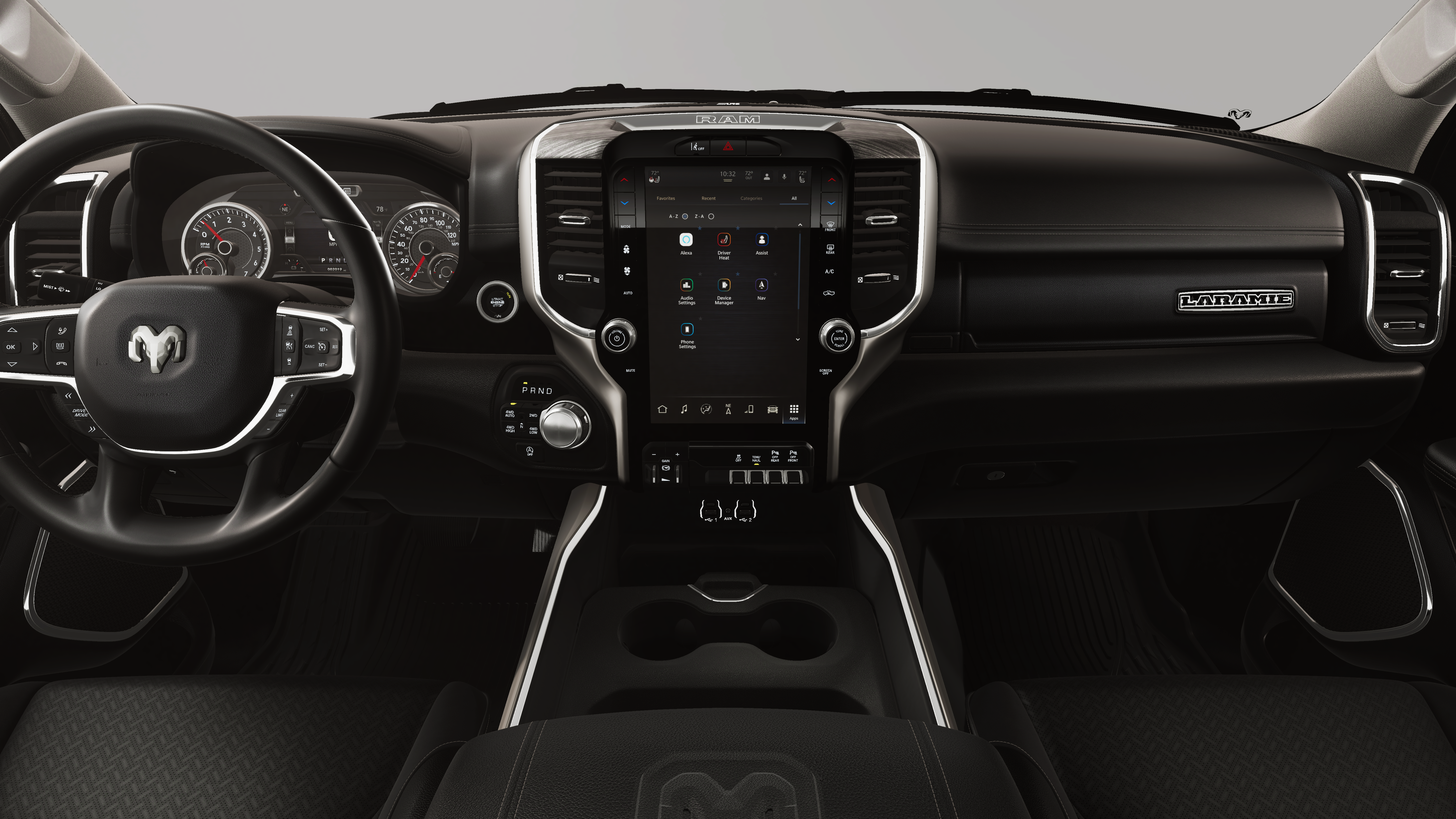 10 Speakers, 3.55 Rear Axle Ratio, 4-Wheel Disc Brakes, 4G LTE Wi-Fi Hot Spot, ABS brakes, Active Noise Control System, Adjustable pedals, Air Conditioning, Alloy wheels, AM/FM radio: SiriusXM with 360L, Apple CarPlay/Android Auto, Audio memory, Auto High-beam Headlights, Auto Power-Folding Mirrors, Auto-dimming door mirrors, Auto-Dimming Exterior Driver Mirror, Auto-dimming Rear-View mirror, Automatic temperature control, Brake assist, Bumpers: chrome, Chrome Exterior Mirrors, Compass, Connected Travel and Traffic Services, Connectivity - US/Canada, Convex Wide-Angle Exterior Mirror Insert, Delay-off headlights, Driver door bin, Driver vanity mirror, Dual front impact airbags, Dual front side impact airbags, Electronic Stability Control, Exterior Mirrors Courtesy Lamps, Exterior Mirrors with Heating Element, Exterior Mirrors with Memory, Exterior Mirrors with Supplemental Signals, Front anti-roll bar, Front Bucket Seats, Front Center Armrest w/Storage, Front dual zone A/C, Front fog lights, Front reading lights, Front wheel independent suspension, Fully automatic headlights, Garage door transmitter, GPS Navigation, Heated door mirrors, Heated front seats, Heated rear seats, Heated steering wheel, Illuminated entry, Integrated Center Stack Radio, Integrated Voice Command with Bluetooth®, Leather steering wheel, Leather Trimmed Bucket Seats, Low tire pressure warning, Memory seat, Navigation System, Occupant sensing airbag, Off-Road Information Pages, Outside temperature display, Overhead airbag, Overhead console, Panic alarm, ParkView Rear Back-Up Camera, Passenger door bin, Passenger vanity mirror, Pedal memory, Power door mirrors, Power driver seat, Power passenger seat, Power steering, Power windows, Radio data system, Radio: Uconnect 5 Navigation with 12.0 Display, RAM Grille Badge - Chrome, Rear anti-roll bar, Rear reading lights, Rear seat center armrest, Rear step bumper, Remote keyless entry, Security system, SiriusXM Radio Service, SiriusXM with 360L, Speed control, Split folding rear seat, Steering wheel mounted audio controls, Tachometer, Telescoping steering wheel, Tilt steering wheel, Traction control, Trip computer, Turn signal indicator mirrors, USB Host Flip, Variably intermittent wipers, Ventilated front seats, Voltmeter, Wheels: 20 x 9 Premium Paint/Polish.