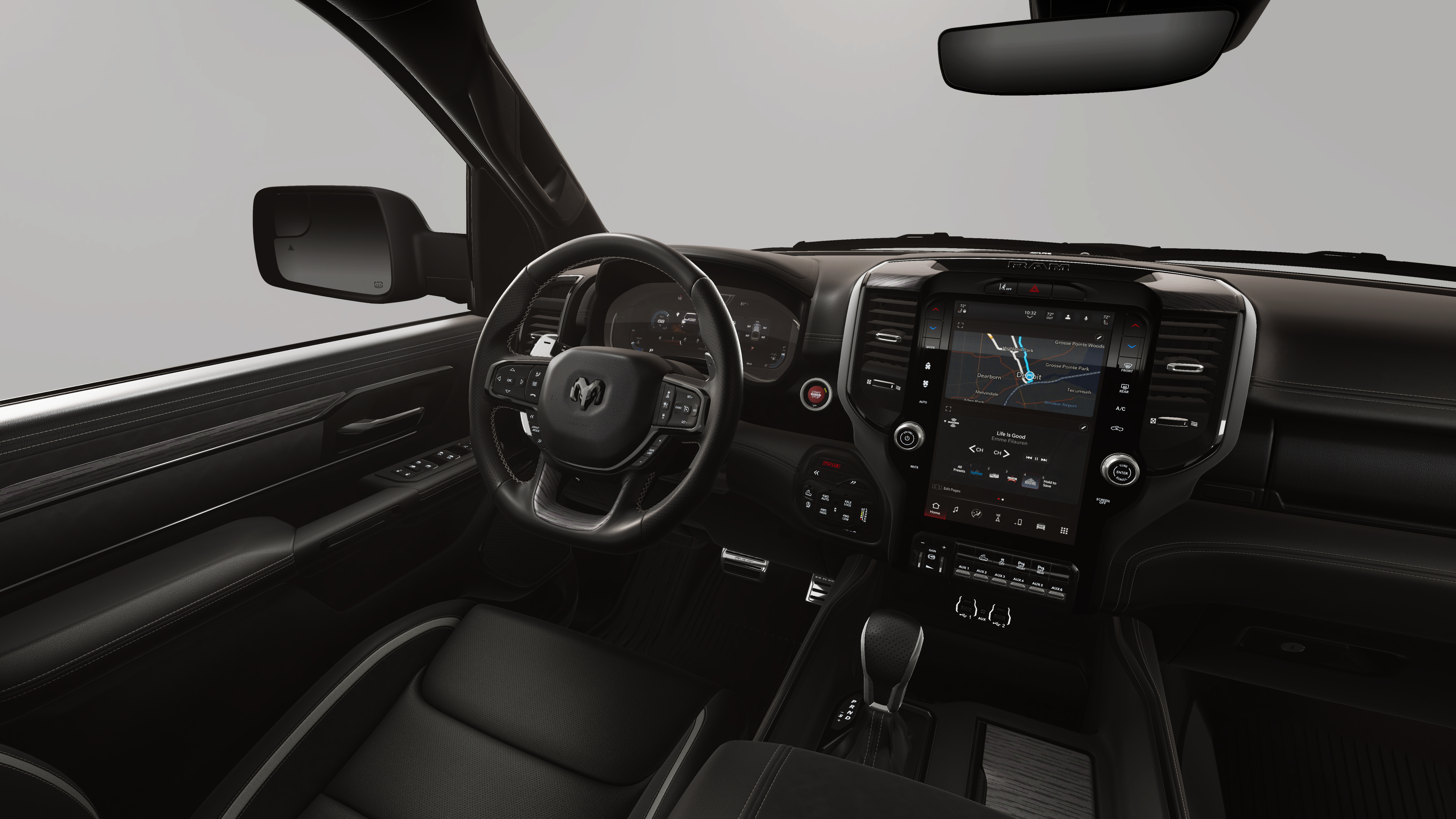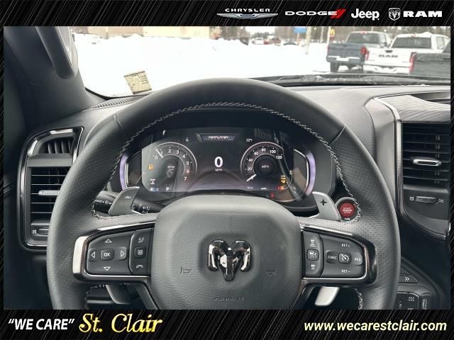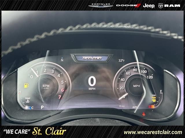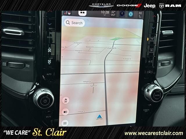 10 Speakers, 3.92 Rear Axle Ratio, 4-Wheel Disc Brakes, 4G LTE Wi-Fi Hot Spot, ABS brakes, Adaptive suspension, Adjustable pedals, Air Conditioning, Alloy wheels, AM/FM radio, Apple CarPlay/Android Auto, Auto High-beam Headlights, Auto Power-Folding Mirrors, Auto-dimming door mirrors, Auto-Dimming Exterior Driver Mirror, Auto-dimming Rear-View mirror, Automatic temperature control, Brake assist, Compass, Connected Travel and Traffic Services, Connectivity - US/Canada, Delay-off headlights, Disassociated Touchscreen Display, Driver door bin, Driver vanity mirror, Dual front impact airbags, Dual front side impact airbags, Electronic Stability Control, Exterior Mirrors Courtesy Lamps, Exterior Mirrors with Heating Element, Exterior Mirrors with Supplemental Signals, Exterior Parking Camera Rear, Flareside Box, Front anti-roll bar, Front Bucket Seats, Front Center Armrest w/Storage, Front dual zone A/C, Front fog lights, Front reading lights, Front wheel independent suspension, Fully automatic headlights, Garage door transmitter, GPS Navigation, HD Radio, Heated door mirrors, Heated front seats, Heated steering wheel, Illuminated entry, Integrated Center Stack Radio, Integrated Voice Command with Bluetooth®, Leather Shift Knob, Leather steering wheel, Leather Trimmed Bucket Seats, Low tire pressure warning, Navigation System, Occupant sensing airbag, Outside temperature display, Overhead airbag, Overhead console, Panic alarm, Passenger door bin, Passenger vanity mirror, Power door mirrors, Power driver seat, Power passenger seat, Power steering, Power windows, Quick Order Package 22Y RHO, Radio data system, Radio: Uconnect 5 Navigation with 12.0 Display, Rear reading lights, Rear seat center armrest, Rear step bumper, Rear window defroster, Remote keyless entry, Security system, SiriusXM Radio Service, Speed control, Split folding rear seat, Sport steering wheel, Steering wheel mounted audio controls, Tachometer, Telescoping steering wheel, Tilt steering wheel, Traction control, Trip computer, Turn signal indicator mirrors, USB Host Flip, Variably intermittent wipers, Voltmeter, Wheels: 18 x 9 Black Paint/Polish Aluminum.