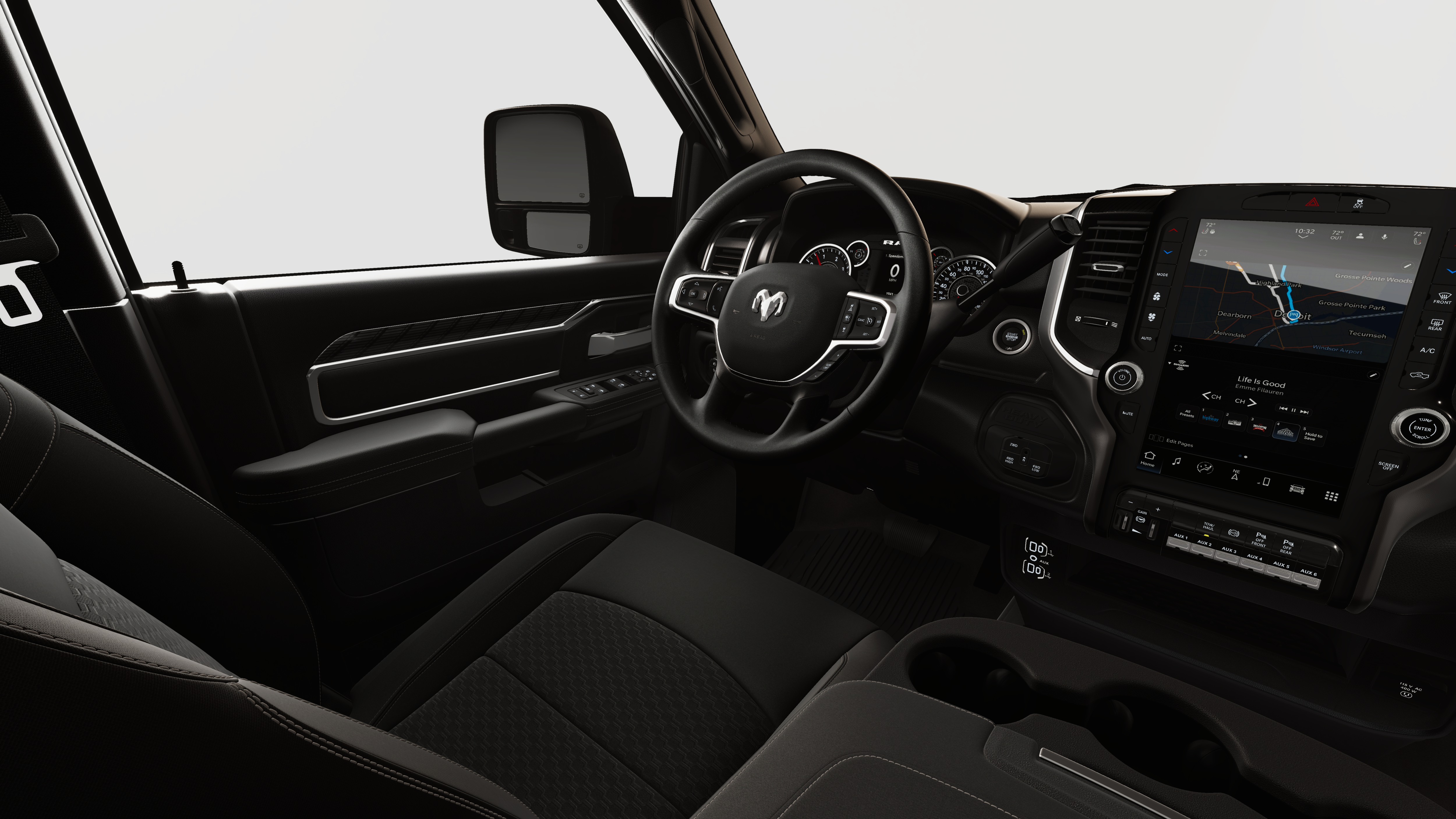 12 Touchscreen Display, 2 Way Rear Headrest Seat, 2nd Row in Floor Storage Bins, 4 Way Front Headrests, 4-Wheel Disc Brakes, 40/20/40 Split Bench Seat, 4G LTE Wi-Fi Hot Spot, 5th Wheel/Gooseneck Towing Prep Group, 6 Speakers, 9 Alpine Speakers with Subwoofer, ABS brakes, Air Conditioning, Air Conditioning ATC with Dual Zone Control, Alexa Built-in, Alloy wheels, AM/FM radio: SiriusXM, Anti-Spin Differential Rear Axle, Apple CarPlay, Apple CarPlay/Android Auto, Auto Power-Folding Mirrors, Auto-Dimming Rear-View Mirror, Big Horn Level 1 Plus Equipment Group, Black Exterior Mirrors, Black Exterior Truck Badging, Black Interior Accents, Black Wheel Center Hub, Body Color Grille-Surround, Brake assist, Bumpers: chrome, Center Hub, Clearance Lamps, Cloth 40/20/40 Bench Seat, Compass, Connected Travel and Traffic Services, Connectivity - US/Canada, Dash Pass Thru Wire Circuits, Delay-off headlights, Disassociated Touchscreen Display, Driver door bin, Dual front impact airbags, Dual front side impact airbags, Dual Glove Boxes, Electronic Stability Control, Emergency Vehicle Alert System (EVAS), Exterior Mirrors Courtesy Lamps, Exterior Mirrors with Heating Element, Exterior Mirrors with Supplemental Signals, Foam Bottle Insert (door Trim Panel), Folding Flat Load Floor Storage, Footwell Courtesy Lamp, For Details, Visit DriveUconnect.com, For More Info, Call 800-643-2112, Forward and Reverse Utility Lights, Front anti-roll bar, Front Armrest with Cupholders, Front Center Armrest w/Storage, Front Center Seat Cushion Storage, Front fog lights, Front reading lights, Front Seat Back Map Pockets, Fully automatic headlights, Global Telematics Box Module, Gloss Black Nostrils/Mic Black Grille, Glove Box Lamp, Google Android Auto, GPS Antenna Input, GPS Navigation, HD Radio, Heated door mirrors, Heated Front Seats, Heated Seats and Wheel Group, Heated Steering Wheel, Illuminated entry, Instrument Panel Mounted Auxiliary Switches, Integrated Voice Command with Bluetooth®, LED Bed Lighting, Locking Lower Glove Box, Low tire pressure warning, Luxury Steering Wheel, Manual Adjust 4-Way Driver Seat, Manual Adjust 4-Way Front Passenger Seat, Manufacturer's Statement of Origin, Mirror Running Lights, MOPAR Deployable Bed Step, MOPAR Front and Rear Rubber Floor Mats, MOPAR Spray in Bedliner, MyFlexCare Service Diesel, Night Edition, Occupant sensing airbag, Off-Road Info Pages, Outside temperature display, Overhead airbag, Overhead console, Painted Front Bumper, Painted Rear Bumper, Panic alarm, ParkView Rear Back-Up Camera, Passenger door bin, Passenger vanity mirror, Power 2-Way Driver Lumbar Adjust, Power Adjust 8-Way Driver Seat, Power Adjust Mirrors, Power door mirrors, Power Heated Folding Telescopic Mirrors, Power steering, Power Telescoping Mirrors, Power windows, Power-Adjustable Convex Aux Mirrors, Premium Cloth 40/20/40 Bench Seat, Quick Order Package 24Z Big Horn, Radio data system, Radio: Uconnect 5 Navigation with 12.0 Display, Radio: Uconnect 5 with 8.4 Display, Rear 60/40 Folding Seat, Rear anti-roll bar, Rear Dome with on/Off Switch Lamp, Rear Folding Seat, Rear seat center armrest, Rear step bumper, Rear Wheelhouse Liners, Rear window defroster, Remote keyless entry, Remote Start System, Remote USB Port - Charge Only, Security system, Selectable Tire Fill Alert, SiriusXM Radio Service, SiriusXM with 360L, Speed control, Steering Wheel Mounted Audio Controls, Storage Tray, Tachometer, Tilt steering wheel, Traction control, Trailer Tow Pages, Trip computer, Turn signal indicator mirrors, Variably intermittent wipers, Voltmeter, Wheels: 18 x 8.0 Polished Aluminum, Wheels: 20 x 8.0 Black Painted Aluminum.