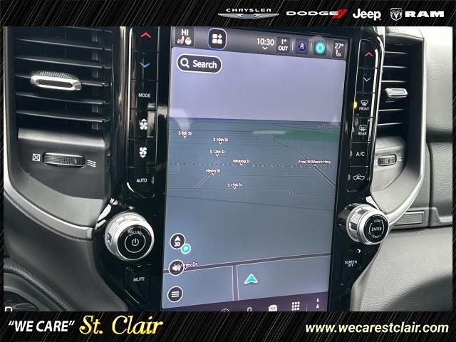 115V Auxiliary Power Outlet, 115V Auxiliary Rear Power Outlet, 12 Touchscreen Display, 2nd Row in Floor Storage Bins, 3 Rear Seat Head Restraints, 4 Way Front Headrests, 4-Wheel Disc Brakes, 400W Inverter, 48V Belt Starter Generator, 4G LTE Wi-Fi Hot Spot, 6 Speakers, 9 Amplified Speakers with Subwoofer, ABS brakes, Accent Color Door Handles, Accent Color Premium Power Mirrors, Accent Color Tailgate Handle, Air Conditioning, Air Conditioning ATC with Dual Zone Control, Alloy wheels, AM/FM radio, Anti-Spin Differential Rear Axle, Apple CarPlay, Apple CarPlay/Android Auto, Auto High-beam Headlights, Auto Power-Folding Mirrors, Auto-Dimming Exterior Driver Mirror, Auto-Dimming Rear-View Mirror, Big Horn Level 2 Equipment Group, Black Exterior Mirrors, Black Exterior Truck Badging, Black Headlamp Bezels, Black Interior Accents, Black Painted Exterior Mirrors Caps, Black Premium Power Mirrors, Black Tail Lamp Bezels, Body Color Fender Flares, Body Color Front Bumper, Body Color Rear Bumper with Step Pads, Brake assist, Bucket Seats, Bumpers: chrome, Center Console Parts Module, Cloth Bucket Seats, Cluster 7.0 TFT Color Display, Compass, Configurable Drive Mode, Connected Travel and Traffic Services, Connectivity - US/Canada, Convex Wide-Angle Exterior Mirror Insert, Delay-off headlights, Deluxe Cloth Bucket Seats, Disassociated Touchscreen Display, Driver door bin, Dual Exhaust with Black Tips, Dual front impact airbags, Dual front side impact airbags, Electronic Stability Control, Exterior Mirrors Courtesy Lamps, Exterior Mirrors with Heating Element, Exterior Mirrors with Supplemental Signals, Front anti-roll bar, Front Bucket Seats, Front Center Armrest w/Storage, Front fog lights, Front reading lights, Front Seat Back Map Pockets, Front wheel independent suspension, Full Length Floor Console, Fully automatic headlights, Global Telematics Box Module, Glove Box Lamp, Google Android Auto, GPS Antenna Input, GPS Navigation, Grille Black Surround Black Mesh, HD Radio, Heated door mirrors, Heated Front Seats, Heated Steering Wheel, Illuminated entry, Integrated Center Stack Radio, Integrated Voice Command with Bluetooth®, Leather Wrapped Steering Wheel, LED Dome Lamp with on/Off Switch, LED Footwell Lighting, Low tire pressure warning, Manual Adjust 4-Way Driver Seat, Manual Adjust 4-Way Front Passenger Seat, Manual Folding Exterior Mirrors, Manufacturer's Statement of Origin, Media Hub with 2 Charge Only USBs, MyFlexCare Service Plan, Night Edition, Occupant sensing airbag, Outside temperature display, Overhead airbag, Overhead console, Overhead LED Lamps, Panic alarm, ParkView Rear Back-Up Camera, Passenger door bin, Passenger vanity mirror, Power 2-Way Driver Lumbar Adjust, Power Adjust 8-Way Driver Seat, Power Adjustable Pedals, Power door mirrors, Power steering, Power windows, Premium Overhead Console, Quick Order Package 23Z Big Horn, Radio data system, Radio: Uconnect 5 Navigation with 12.0 Display, Radio: Uconnect 5 W with 8.4 Display, RAM Grille Badge - Black, RAM Grille Badge - Chrome, Rear 60/40 Folding Seat, Rear anti-roll bar, Rear Center Armrest, Rear Power Sliding Window, Rear step bumper, Rear Window Defroster, Remote keyless entry, Remote Tailgate Release, Security Alarm, SiriusXM Radio Service, SiriusXM with 360L, Speed control, Steering Wheel Mounted Audio Controls, Sun Visors with Illuminated Vanity Mirrors, Supplier Part Tracking (J-1), Tachometer, Telescoping steering wheel, Tilt steering wheel, Traction control, Trip computer, Universal Garage Door Opener, USB Host Flip, Variably intermittent wipers, Voltmeter, Wheels: 20 x 9.0 Aluminum Painted Clad.