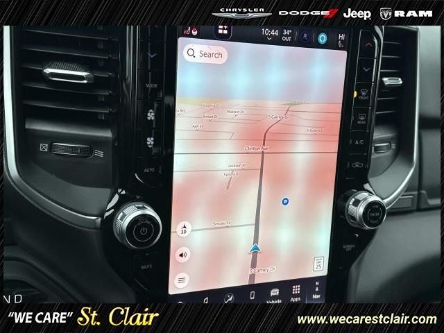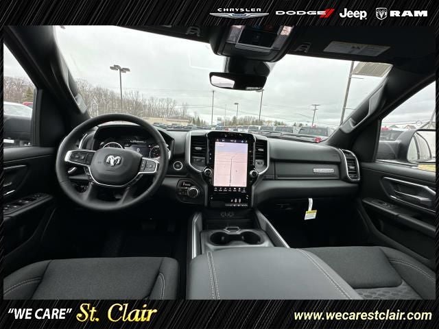 115V Auxiliary Power Outlet, 115V Auxiliary Rear Power Outlet, 12 Touchscreen Display, 2nd Row in Floor Storage Bins, 3 Rear Seat Head Restraints, 4 Way Front Headrests, 4-Wheel Disc Brakes, 400W Inverter, 48V Belt Starter Generator, 4G LTE Wi-Fi Hot Spot, 6 Speakers, 9 Amplified Speakers with Subwoofer, ABS brakes, Accent Color Door Handles, Accent Color Premium Power Mirrors, Accent Color Tailgate Handle, Air Conditioning, Air Conditioning ATC with Dual Zone Control, Alloy wheels, AM/FM radio, Anti-Spin Differential Rear Axle, Apple CarPlay, Apple CarPlay/Android Auto, Auto High-beam Headlights, Auto Power-Folding Mirrors, Auto-Dimming Exterior Driver Mirror, Auto-Dimming Rear-View Mirror, Big Horn Level 2 Equipment Group, Black Exterior Mirrors, Black Exterior Truck Badging, Black Headlamp Bezels, Black Interior Accents, Black Painted Exterior Mirrors Caps, Black Premium Power Mirrors, Black Tail Lamp Bezels, Body Color Fender Flares, Body Color Front Bumper, Body Color Rear Bumper with Step Pads, Brake assist, Bucket Seats, Bumpers: chrome, Center Console Parts Module, Cloth Bucket Seats, Cluster 7.0 TFT Color Display, Compass, Configurable Drive Mode, Connected Travel and Traffic Services, Connectivity - US/Canada, Convex Wide-Angle Exterior Mirror Insert, Delay-off headlights, Deluxe Cloth Bucket Seats, Disassociated Touchscreen Display, Driver door bin, Dual Exhaust with Black Tips, Dual front impact airbags, Dual front side impact airbags, Electronic Stability Control, Exterior Mirrors Courtesy Lamps, Exterior Mirrors with Heating Element, Exterior Mirrors with Supplemental Signals, Front anti-roll bar, Front Bucket Seats, Front Center Armrest w/Storage, Front fog lights, Front reading lights, Front Seat Back Map Pockets, Front wheel independent suspension, Full Length Floor Console, Fully automatic headlights, Global Telematics Box Module, Glove Box Lamp, Google Android Auto, GPS Antenna Input, GPS Navigation, Grille Black Surround Black Mesh, HD Radio, Heated door mirrors, Heated Front Seats, Heated Steering Wheel, Illuminated entry, Integrated Center Stack Radio, Integrated Voice Command with Bluetooth®, Leather Wrapped Steering Wheel, LED Dome Lamp with on/Off Switch, LED Footwell Lighting, Low tire pressure warning, Manual Adjust 4-Way Driver Seat, Manual Adjust 4-Way Front Passenger Seat, Manual Folding Exterior Mirrors, Manufacturer's Statement of Origin, Media Hub with 2 Charge Only USBs, MyFlexCare Service Plan, Night Edition, Occupant sensing airbag, Outside temperature display, Overhead airbag, Overhead console, Overhead LED Lamps, Panic alarm, ParkView Rear Back-Up Camera, Passenger door bin, Passenger vanity mirror, Power 2-Way Driver Lumbar Adjust, Power Adjust 8-Way Driver Seat, Power Adjustable Pedals, Power door mirrors, Power steering, Power windows, Premium Overhead Console, Quick Order Package 23Z Big Horn, Radio data system, Radio: Uconnect 5 Navigation with 12.0 Display, Radio: Uconnect 5 W with 8.4 Display, RAM Grille Badge - Black, RAM Grille Badge - Chrome, Rear 60/40 Folding Seat, Rear anti-roll bar, Rear Center Armrest, Rear Power Sliding Window, Rear step bumper, Rear Window Defroster, Remote keyless entry, Remote Tailgate Release, Security Alarm, SiriusXM Radio Service, SiriusXM with 360L, Speed control, Steering Wheel Mounted Audio Controls, Sun Visors with Illuminated Vanity Mirrors, Supplier Part Tracking (J-1), Tachometer, Telescoping steering wheel, Tilt steering wheel, Traction control, Trip computer, Universal Garage Door Opener, USB Host Flip, Variably intermittent wipers, Voltmeter, Wheels: 20 x 9.0 Aluminum Painted Clad.