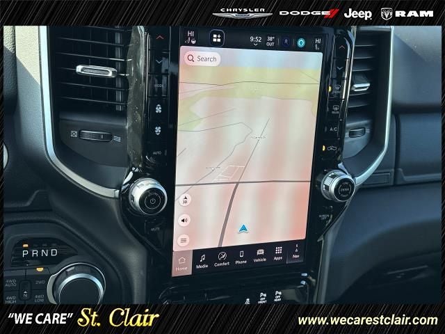 115V Auxiliary Power Outlet, 115V Auxiliary Rear Power Outlet, 12 Touchscreen Display, 2nd Row in Floor Storage Bins, 3 Rear Seat Head Restraints, 4 Way Front Headrests, 4-Wheel Disc Brakes, 400W Inverter, 48V Belt Starter Generator, 4G LTE Wi-Fi Hot Spot, 6 Speakers, 9 Amplified Speakers with Subwoofer, ABS brakes, Accent Color Door Handles, Accent Color Premium Power Mirrors, Accent Color Tailgate Handle, Air Conditioning, Air Conditioning ATC with Dual Zone Control, Alloy wheels, AM/FM radio, Anti-Spin Differential Rear Axle, Apple CarPlay, Apple CarPlay/Android Auto, Auto High-beam Headlights, Auto Power-Folding Mirrors, Auto-Dimming Exterior Driver Mirror, Auto-Dimming Rear-View Mirror, Big Horn Level 2 Equipment Group, Black Exterior Mirrors, Black Exterior Truck Badging, Black Headlamp Bezels, Black Interior Accents, Black Painted Exterior Mirrors Caps, Black Premium Power Mirrors, Black Tail Lamp Bezels, Body Color Fender Flares, Body Color Front Bumper, Body Color Rear Bumper with Step Pads, Brake assist, Bucket Seats, Bumpers: chrome, Center Console Parts Module, Cloth Bucket Seats, Cluster 7.0 TFT Color Display, Compass, Configurable Drive Mode, Connected Travel and Traffic Services, Connectivity - US/Canada, Convex Wide-Angle Exterior Mirror Insert, Delay-off headlights, Deluxe Cloth Bucket Seats, Disassociated Touchscreen Display, Driver door bin, Dual Exhaust with Black Tips, Dual front impact airbags, Dual front side impact airbags, Electronic Stability Control, Exterior Mirrors Courtesy Lamps, Exterior Mirrors with Heating Element, Exterior Mirrors with Supplemental Signals, Front anti-roll bar, Front Bucket Seats, Front Center Armrest w/Storage, Front fog lights, Front reading lights, Front Seat Back Map Pockets, Front wheel independent suspension, Full Length Floor Console, Fully automatic headlights, Global Telematics Box Module, Glove Box Lamp, Google Android Auto, GPS Antenna Input, GPS Navigation, Grille Black Surround Black Mesh, HD Radio, Heated door mirrors, Heated Front Seats, Heated Steering Wheel, Illuminated entry, Integrated Center Stack Radio, Integrated Voice Command with Bluetooth®, Leather Wrapped Steering Wheel, LED Dome Lamp with on/Off Switch, LED Footwell Lighting, Low tire pressure warning, Manual Adjust 4-Way Driver Seat, Manual Adjust 4-Way Front Passenger Seat, Manual Folding Exterior Mirrors, Manufacturer's Statement of Origin, Media Hub with 2 Charge Only USBs, MyFlexCare Service Plan, Night Edition, Occupant sensing airbag, Outside temperature display, Overhead airbag, Overhead console, Overhead LED Lamps, Panic alarm, ParkView Rear Back-Up Camera, Passenger door bin, Passenger vanity mirror, Power 2-Way Driver Lumbar Adjust, Power Adjust 8-Way Driver Seat, Power Adjustable Pedals, Power door mirrors, Power steering, Power windows, Premium Overhead Console, Quick Order Package 27Z Big Horn, Radio data system, Radio: Uconnect 5 Navigation with 12.0 Display, Radio: Uconnect 5 W with 8.4 Display, RAM Grille Badge - Black, RAM Grille Badge - Chrome, Rear 60/40 Folding Seat, Rear anti-roll bar, Rear Center Armrest, Rear Power Sliding Window, Rear step bumper, Rear Window Defroster, Remote keyless entry, Remote Tailgate Release, Security Alarm, SiriusXM Radio Service, SiriusXM with 360L, Speed control, Steering Wheel Mounted Audio Controls, Sun Visors with Illuminated Vanity Mirrors, Supplier Part Tracking (J-1), Tachometer, Telescoping steering wheel, Tilt steering wheel, Traction control, Trailer Brake Control, Trip computer, Universal Garage Door Opener, USB Host Flip, Variably intermittent wipers, Voltmeter, Wheels: 20 x 9.0 Aluminum Painted Clad.