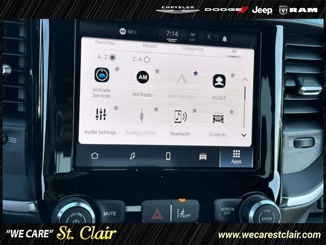 115V Auxiliary Power Outlet, 2nd Row in Floor Storage Bins, 3 Rear Seat Head Restraints, 33 Gallon Fuel Tank, 4 Way Front Headrests, 4-Wheel Disc Brakes, 400W Inverter, 48V Belt Starter Generator, 4G LTE Wi-Fi Hot Spot, 6 Speakers, ABS brakes, Air Conditioning, Alloy wheels, AM/FM radio, Apple CarPlay, Apple CarPlay/Android Auto, Auto High-beam Headlights, Auto Power-Folding Mirrors, Auto-Dimming Exterior Driver Mirror, Auto-Dimming Rear-View Mirror, Big Horn Level 1 Equipment Group, Black Exterior Mirrors, Black Premium Power Mirrors, Body Color Fender Flares, Brake assist, Bucket Seats, Bumpers: chrome, Center Console Parts Module, Cloth Bucket Seats, Compass, Connectivity - US/Canada, Convex Wide-Angle Exterior Mirror Insert, Delay-off headlights, Deluxe Cloth Bucket Seats, Driver door bin, Dual front impact airbags, Dual front side impact airbags, Electronic Stability Control, Exterior Mirrors Courtesy Lamps, Exterior Mirrors with Heating Element, Exterior Mirrors with Supplemental Signals, Front anti-roll bar, Front Bucket Seats, Front Center Armrest w/Storage, Front fog lights, Front reading lights, Front Seat Back Map Pockets, Front wheel independent suspension, Full Length Floor Console, Fully automatic headlights, Global Telematics Box Module, Glove Box Lamp, Google Android Auto, GPS Antenna Input, Heated door mirrors, Heated Front Seats, Heated Steering Wheel, Illuminated entry, Integrated Center Stack Radio, Integrated Voice Command with Bluetooth®, Leather Wrapped Steering Wheel, Low tire pressure warning, Manual Adjust 4-Way Driver Seat, Manual Adjust 4-Way Front Passenger Seat, Manual Folding Exterior Mirrors, Manufacturer's Statement of Origin, Occupant sensing airbag, Outside temperature display, Overhead airbag, Overhead console, Panic alarm, ParkView Rear Back-Up Camera, Passenger door bin, Passenger vanity mirror, Power 2-Way Driver Lumbar Adjust, Power Adjust 8-Way Driver Seat, Power Adjustable Pedals, Power door mirrors, Power steering, Power windows, Quick Order Package 27Z Big Horn, Radio data system, Radio: Uconnect 5 W with 8.4 Display, RAM Grille Badge - Chrome, Rear 60/40 Folding Seat, Rear anti-roll bar, Rear Center Armrest, Rear Dome with on/Off Switch Lamp, Rear Power Sliding Window, Rear step bumper, Rear Window Defroster, Remote keyless entry, SiriusXM Radio Service, SiriusXM Satellite Radio, Speed control, Steering Wheel Mounted Audio Controls, Sun Visors with Illuminated Vanity Mirrors, Supplier Part Tracking (J-1), Tachometer, Telescoping steering wheel, Tilt steering wheel, Traction control, Trip computer, Universal Garage Door Opener, USB Host Flip, Variably intermittent wipers, Voltmeter, Wheels: 20 x 9 Aluminum Chrome Clad.