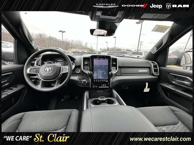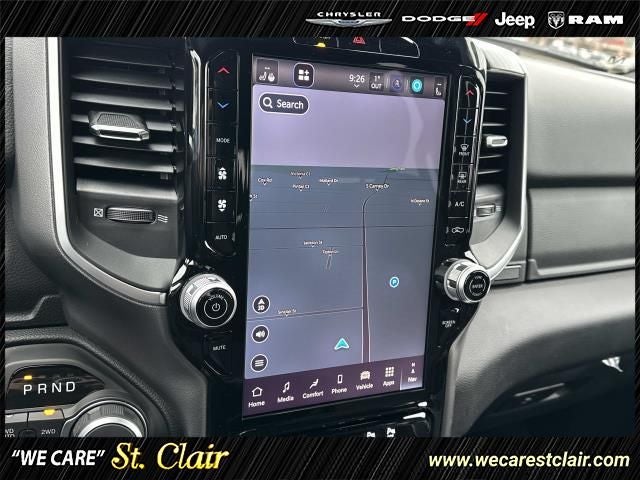 115V Auxiliary Power Outlet, 115V Auxiliary Rear Power Outlet, 12 Touchscreen Display, 2nd Row in Floor Storage Bins, 3 Rear Seat Head Restraints, 4 Way Front Headrests, 4-Wheel Disc Brakes, 400W Inverter, 48V Belt Starter Generator, 4G LTE Wi-Fi Hot Spot, 6 Speakers, 9 Amplified Speakers with Subwoofer, ABS brakes, Accent Color Door Handles, Accent Color Premium Power Mirrors, Accent Color Tailgate Handle, Air Conditioning, Air Conditioning ATC with Dual Zone Control, Alloy wheels, AM/FM radio, Anti-Spin Differential Rear Axle, Apple CarPlay, Apple CarPlay/Android Auto, Auto High-beam Headlights, Auto Power-Folding Mirrors, Auto-Dimming Exterior Driver Mirror, Auto-Dimming Rear-View Mirror, Big Horn Level 2 Equipment Group, Black Exterior Mirrors, Black Exterior Truck Badging, Black Headlamp Bezels, Black Interior Accents, Black Painted Exterior Mirrors Caps, Black Premium Power Mirrors, Black Tail Lamp Bezels, Body Color Fender Flares, Body Color Front Bumper, Body Color Rear Bumper with Step Pads, Brake assist, Bucket Seats, Bumpers: chrome, Center Console Parts Module, Cloth Bucket Seats, Cluster 7.0 TFT Color Display, Compass, Configurable Drive Mode, Connected Travel and Traffic Services, Connectivity - US/Canada, Convex Wide-Angle Exterior Mirror Insert, Delay-off headlights, Deluxe Cloth Bucket Seats, Disassociated Touchscreen Display, Driver door bin, Dual Exhaust with Black Tips, Dual front impact airbags, Dual front side impact airbags, Electronic Stability Control, Exterior Mirrors Courtesy Lamps, Exterior Mirrors with Heating Element, Exterior Mirrors with Supplemental Signals, Front anti-roll bar, Front Bucket Seats, Front Center Armrest w/Storage, Front fog lights, Front reading lights, Front Seat Back Map Pockets, Front wheel independent suspension, Full Length Floor Console, Fully automatic headlights, Global Telematics Box Module, Glove Box Lamp, Google Android Auto, GPS Antenna Input, GPS Navigation, Grille Black Surround Black Mesh, HD Radio, Heated door mirrors, Heated Front Seats, Heated Steering Wheel, Illuminated entry, Integrated Center Stack Radio, Integrated Voice Command with Bluetooth®, Leather Wrapped Steering Wheel, LED Dome Lamp with on/Off Switch, LED Footwell Lighting, Low tire pressure warning, Manual Adjust 4-Way Driver Seat, Manual Adjust 4-Way Front Passenger Seat, Manual Folding Exterior Mirrors, Manufacturer's Statement of Origin, Media Hub with 2 Charge Only USBs, MyFlexCare Service Plan, Night Edition, Occupant sensing airbag, Outside temperature display, Overhead airbag, Overhead console, Overhead LED Lamps, Panic alarm, ParkView Rear Back-Up Camera, Passenger door bin, Passenger vanity mirror, Power 2-Way Driver Lumbar Adjust, Power Adjust 8-Way Driver Seat, Power Adjustable Pedals, Power door mirrors, Power steering, Power windows, Premium Overhead Console, Quick Order Package 27Z Big Horn, Radio data system, Radio: Uconnect 5 Navigation with 12.0 Display, Radio: Uconnect 5 W with 8.4 Display, RAM Grille Badge - Black, RAM Grille Badge - Chrome, Rear 60/40 Folding Seat, Rear anti-roll bar, Rear Center Armrest, Rear Power Sliding Window, Rear step bumper, Rear Window Defroster, Remote keyless entry, Remote Tailgate Release, Security Alarm, SiriusXM Radio Service, SiriusXM with 360L, Speed control, Steering Wheel Mounted Audio Controls, Sun Visors with Illuminated Vanity Mirrors, Supplier Part Tracking (J-1), Tachometer, Telescoping steering wheel, Tilt steering wheel, Traction control, Trailer Brake Control, Trip computer, Universal Garage Door Opener, USB Host Flip, Variably intermittent wipers, Voltmeter, Wheels: 20 x 9.0 Aluminum Painted Clad.