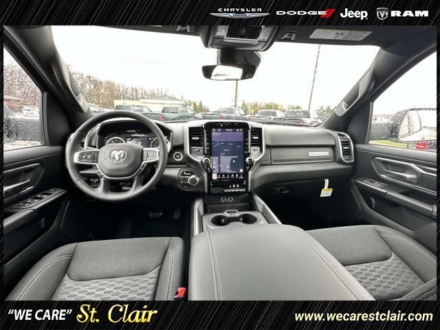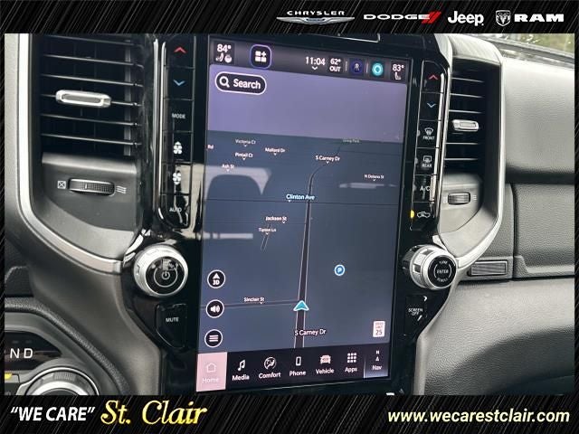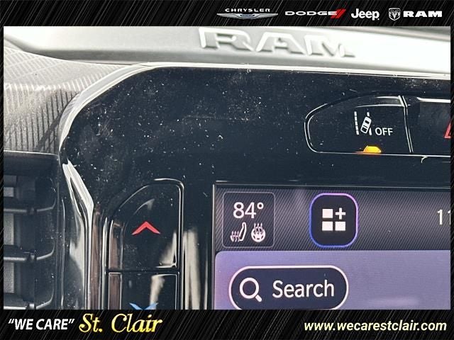 115V Auxiliary Power Outlet, 115V Auxiliary Rear Power Outlet, 12 Touchscreen Display, 2nd Row in Floor Storage Bins, 3 Rear Seat Head Restraints, 4 Way Front Headrests, 4-Wheel Disc Brakes, 400W Inverter, 48V Belt Starter Generator, 4G LTE Wi-Fi Hot Spot, 6 Speakers, 9 Amplified Speakers with Subwoofer, ABS brakes, Accent Color Door Handles, Accent Color Premium Power Mirrors, Accent Color Tailgate Handle, Air Conditioning, Air Conditioning ATC with Dual Zone Control, Alloy wheels, AM/FM radio, Anti-Spin Differential Rear Axle, Apple CarPlay, Apple CarPlay/Android Auto, Auto High-beam Headlights, Auto Power-Folding Mirrors, Auto-Dimming Exterior Driver Mirror, Auto-Dimming Rear-View Mirror, Big Horn Level 2 Equipment Group, Black Exterior Mirrors, Black Exterior Truck Badging, Black Headlamp Bezels, Black Interior Accents, Black Painted Exterior Mirrors Caps, Black Premium Power Mirrors, Black Tail Lamp Bezels, Body Color Fender Flares, Body Color Front Bumper, Body Color Rear Bumper with Step Pads, Brake assist, Bucket Seats, Bumpers: chrome, Center Console Parts Module, Cloth Bucket Seats, Cluster 7.0 TFT Color Display, Compass, Configurable Drive Mode, Connected Travel and Traffic Services, Connectivity - US/Canada, Convex Wide-Angle Exterior Mirror Insert, Delay-off headlights, Deluxe Cloth Bucket Seats, Disassociated Touchscreen Display, Driver door bin, Dual Exhaust with Black Tips, Dual front impact airbags, Dual front side impact airbags, Electronic Stability Control, Exterior Mirrors Courtesy Lamps, Exterior Mirrors with Heating Element, Exterior Mirrors with Supplemental Signals, Front anti-roll bar, Front Bucket Seats, Front Center Armrest w/Storage, Front fog lights, Front reading lights, Front Seat Back Map Pockets, Front wheel independent suspension, Full Length Floor Console, Fully automatic headlights, Global Telematics Box Module, Glove Box Lamp, Google Android Auto, GPS Antenna Input, GPS Navigation, Grille Black Surround Black Mesh, HD Radio, Heated door mirrors, Heated Front Seats, Heated Steering Wheel, Illuminated entry, Integrated Center Stack Radio, Integrated Voice Command with Bluetooth®, Leather Wrapped Steering Wheel, LED Dome Lamp with on/Off Switch, LED Footwell Lighting, Low tire pressure warning, Manual Adjust 4-Way Driver Seat, Manual Adjust 4-Way Front Passenger Seat, Manual Folding Exterior Mirrors, Manufacturer's Statement of Origin, Media Hub with 2 Charge Only USBs, MyFlexCare Service Plan, Night Edition, Occupant sensing airbag, Outside temperature display, Overhead airbag, Overhead console, Overhead LED Lamps, Panic alarm, ParkView Rear Back-Up Camera, Passenger door bin, Passenger vanity mirror, Power 2-Way Driver Lumbar Adjust, Power Adjust 8-Way Driver Seat, Power Adjustable Pedals, Power door mirrors, Power steering, Power windows, Premium Overhead Console, Quick Order Package 23Z Big Horn, Radio data system, Radio: Uconnect 5 Navigation with 12.0 Display, Radio: Uconnect 5 W with 8.4 Display, RAM Grille Badge - Black, RAM Grille Badge - Chrome, Rear 60/40 Folding Seat, Rear anti-roll bar, Rear Center Armrest, Rear Power Sliding Window, Rear step bumper, Rear Window Defroster, Remote keyless entry, Remote Tailgate Release, Security Alarm, SiriusXM Radio Service, SiriusXM with 360L, Speed control, Steering Wheel Mounted Audio Controls, Sun Visors with Illuminated Vanity Mirrors, Supplier Part Tracking (J-1), Tachometer, Telescoping steering wheel, Tilt steering wheel, Traction control, Trip computer, Universal Garage Door Opener, USB Host Flip, Variably intermittent wipers, Voltmeter, Wheels: 20 x 9.0 Aluminum Painted Clad.