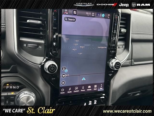 10 Speakers, 4-Wheel Disc Brakes, 4G LTE Wi-Fi Hot Spot, ABS brakes, Active Noise Control System, Adjustable pedals, Air Conditioning, Alloy wheels, AM/FM radio: SiriusXM with 360L, Apple CarPlay/Android Auto, Audio memory, Auto High-beam Headlights, Auto Power-Folding Mirrors, Auto-dimming door mirrors, Auto-Dimming Exterior Driver Mirror, Auto-dimming Rear-View mirror, Automatic temperature control, Brake assist, Bumpers: chrome, Chrome Exterior Mirrors, Compass, Connected Travel and Traffic Services, Connectivity - US/Canada, Convex Wide-Angle Exterior Mirror Insert, Delay-off headlights, Driver door bin, Driver vanity mirror, Dual front impact airbags, Dual front side impact airbags, Electronic Stability Control, Exterior Mirrors Courtesy Lamps, Exterior Mirrors with Heating Element, Exterior Mirrors with Memory, Exterior Mirrors with Supplemental Signals, Front anti-roll bar, Front Bucket Seats, Front Center Armrest w/Storage, Front dual zone A/C, Front fog lights, Front reading lights, Front wheel independent suspension, Fully automatic headlights, Garage door transmitter, GPS Navigation, Heated door mirrors, Heated front seats, Heated rear seats, Heated steering wheel, Illuminated entry, Integrated Center Stack Radio, Integrated Voice Command with Bluetooth®, Laramie Level 1 Equipment Group, Leather steering wheel, Leather Trimmed Bucket Seats, Low tire pressure warning, Manufacturer's Statement of Origin, Memory seat, MOPAR Front and Rear Rubber Floor Mats, MyFlexCare Service Plan, Navigation System, Occupant sensing airbag, Off-Road Information Pages, Outside temperature display, Overhead airbag, Overhead console, Panic alarm, ParkView Rear Back-Up Camera, Passenger door bin, Passenger vanity mirror, Pedal memory, Power door mirrors, Power driver seat, Power passenger seat, Power steering, Power windows, Quick Order Package 27H Laramie, Radio data system, Radio: Uconnect 5 Navigation with 12.0 Display, Rain Sensitive Windshield Wipers, RAM Grille Badge - Chrome, Rear anti-roll bar, Rear reading lights, Rear seat center armrest, Rear step bumper, Remote keyless entry, Remote Tailgate Release, Security system, SiriusXM Radio Service, SiriusXM with 360L, Speed control, Split folding rear seat, Steering wheel mounted audio controls, Tachometer, Telescoping steering wheel, Tilt steering wheel, Traction control, Trailer Brake Control, Trip computer, Turn signal indicator mirrors, USB Host Flip, Variably intermittent wipers, Ventilated front seats, Voltmeter, Wheels: 20 x 9 Premium Paint/Polish.