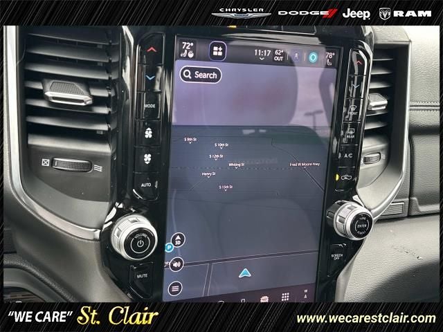 10 Speakers, 4-Wheel Disc Brakes, 4G LTE Wi-Fi Hot Spot, ABS brakes, Active Noise Control System, Adjustable pedals, Air Conditioning, Alloy wheels, AM/FM radio: SiriusXM with 360L, Apple CarPlay/Android Auto, Audio memory, Auto High-beam Headlights, Auto Power-Folding Mirrors, Auto-dimming door mirrors, Auto-Dimming Exterior Driver Mirror, Auto-dimming Rear-View mirror, Automatic temperature control, Brake assist, Bumpers: chrome, Chrome Exterior Mirrors, Compass, Connected Travel and Traffic Services, Connectivity - US/Canada, Convex Wide-Angle Exterior Mirror Insert, Delay-off headlights, Driver door bin, Driver vanity mirror, Dual front impact airbags, Dual front side impact airbags, Electronic Stability Control, Exterior Mirrors Courtesy Lamps, Exterior Mirrors with Heating Element, Exterior Mirrors with Memory, Exterior Mirrors with Supplemental Signals, Front anti-roll bar, Front Bucket Seats, Front Center Armrest w/Storage, Front dual zone A/C, Front fog lights, Front reading lights, Front wheel independent suspension, Fully automatic headlights, Garage door transmitter, GPS Navigation, Heated door mirrors, Heated front seats, Heated rear seats, Heated steering wheel, Illuminated entry, Integrated Center Stack Radio, Integrated Voice Command with Bluetooth®, Laramie Level 1 Equipment Group, Leather steering wheel, Leather Trimmed Bucket Seats, Low tire pressure warning, Manufacturer's Statement of Origin, Memory seat, MOPAR Front and Rear Rubber Floor Mats, MyFlexCare Service Plan, Navigation System, Occupant sensing airbag, Off-Road Information Pages, Outside temperature display, Overhead airbag, Overhead console, Panic alarm, ParkView Rear Back-Up Camera, Passenger door bin, Passenger vanity mirror, Pedal memory, Power door mirrors, Power driver seat, Power passenger seat, Power steering, Power windows, Quick Order Package 27H Laramie, Radio data system, Radio: Uconnect 5 Navigation with 12.0 Display, Rain Sensitive Windshield Wipers, RAM Grille Badge - Chrome, Rear anti-roll bar, Rear reading lights, Rear seat center armrest, Rear step bumper, Remote keyless entry, Remote Tailgate Release, Security system, SiriusXM Radio Service, SiriusXM with 360L, Speed control, Split folding rear seat, Steering wheel mounted audio controls, Tachometer, Telescoping steering wheel, Tilt steering wheel, Traction control, Trailer Brake Control, Trip computer, Turn signal indicator mirrors, USB Host Flip, Variably intermittent wipers, Ventilated front seats, Voltmeter, Wheels: 20 x 9 Premium Paint/Polish.