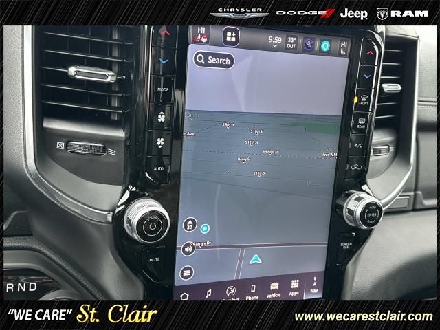 10 Speakers, 4-Wheel Disc Brakes, 4G LTE Wi-Fi Hot Spot, ABS brakes, Active Noise Control System, Adjustable pedals, Air Conditioning, Alloy wheels, AM/FM radio: SiriusXM with 360L, Apple CarPlay/Android Auto, Audio memory, Auto High-beam Headlights, Auto Power-Folding Mirrors, Auto-dimming door mirrors, Auto-Dimming Exterior Driver Mirror, Auto-dimming Rear-View mirror, Automatic temperature control, Brake assist, Bumpers: chrome, Chrome Exterior Mirrors, Compass, Connected Travel and Traffic Services, Connectivity - US/Canada, Convex Wide-Angle Exterior Mirror Insert, Delay-off headlights, Driver door bin, Driver vanity mirror, Dual front impact airbags, Dual front side impact airbags, Electronic Stability Control, Exterior Mirrors Courtesy Lamps, Exterior Mirrors with Heating Element, Exterior Mirrors with Memory, Exterior Mirrors with Supplemental Signals, Front anti-roll bar, Front Bucket Seats, Front Center Armrest w/Storage, Front dual zone A/C, Front fog lights, Front reading lights, Front wheel independent suspension, Fully automatic headlights, Garage door transmitter, GPS Navigation, Heated door mirrors, Heated front seats, Heated rear seats, Heated steering wheel, Illuminated entry, Integrated Center Stack Radio, Integrated Voice Command with Bluetooth®, Laramie Level 1 Equipment Group, Leather steering wheel, Leather Trimmed Bucket Seats, Low tire pressure warning, Manufacturer's Statement of Origin, Memory seat, MOPAR Front and Rear Rubber Floor Mats, MyFlexCare Service Plan, Navigation System, Occupant sensing airbag, Off-Road Information Pages, Outside temperature display, Overhead airbag, Overhead console, Panic alarm, ParkView Rear Back-Up Camera, Passenger door bin, Passenger vanity mirror, Pedal memory, Power door mirrors, Power driver seat, Power passenger seat, Power steering, Power windows, Quick Order Package 27H Laramie, Radio data system, Radio: Uconnect 5 Navigation with 12.0 Display, Rain Sensitive Windshield Wipers, RAM Grille Badge - Chrome, Rear anti-roll bar, Rear reading lights, Rear seat center armrest, Rear step bumper, Remote keyless entry, Remote Tailgate Release, Security system, SiriusXM Radio Service, SiriusXM with 360L, Speed control, Split folding rear seat, Steering wheel mounted audio controls, Tachometer, Telescoping steering wheel, Tilt steering wheel, Traction control, Trailer Brake Control, Trip computer, Turn signal indicator mirrors, USB Host Flip, Variably intermittent wipers, Ventilated front seats, Voltmeter, Wheels: 20 x 9 Premium Paint/Polish.