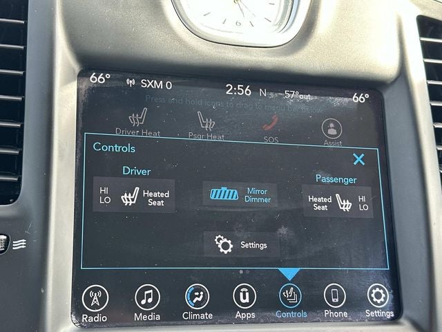 19 x 7.5 Polished Aluminum Wheels, 4-Wheel Disc Brakes, 6 Speakers, ABS brakes, Air Conditioning, Alloy wheels, AM/FM radio: SiriusXM, Anti-whiplash front head restraints, Apple CarPlay/Android Auto, Auto-dimming Rear-View mirror, Automatic temperature control, Brake assist, Bumpers: body-color, Compass, Delay-off headlights, Driver door bin, Driver vanity mirror, Dual front impact airbags, Dual front side impact airbags, Electronic Stability Control, Emergency communication system: Uconnect Access, Exterior Parking Camera Rear, Four wheel independent suspension, Front anti-roll bar, Front Bucket Seats, Front Center Armrest, Front dual zone A/C, Front reading lights, Fully automatic headlights, Heated door mirrors, Heated front seats, Illuminated entry, Knee airbag, Leather Trimmed Bucket Seats, Low tire pressure warning, Occupant sensing airbag, Outside temperature display, Overhead airbag, Overhead console, Panic alarm, Passenger door bin, Passenger vanity mirror, Power door mirrors, Power driver seat, Power Driver/Passenger 4-Way Lumbar Adjust, Power Front Driver/Passenger Seats, Power passenger seat, Power steering, Power windows, Quick Order Package 22F, Radio data system, Radio: Uconnect 4C w/8.4 Display, Rear anti-roll bar, Rear reading lights, Rear seat center armrest, Rear window defroster, Remote keyless entry, Security system, Speed control, Speed-sensing steering, Speed-Sensitive Wipers, Split folding rear seat, Steering wheel mounted audio controls, Tachometer, Telescoping steering wheel, Tilt steering wheel, Traction control, Trip computer, Variably intermittent wipers.