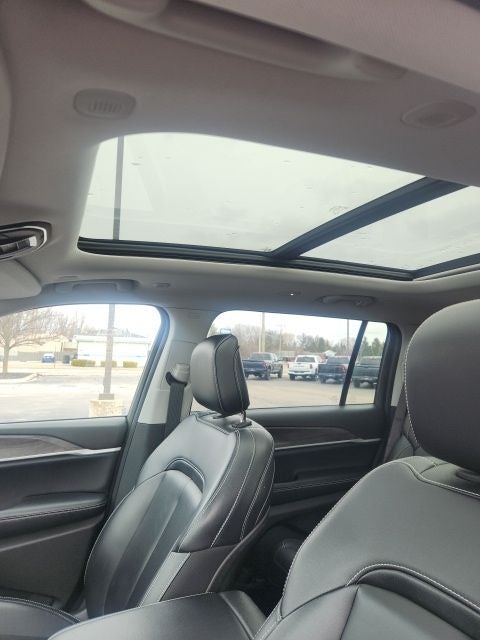 3.45 Rear Axle Ratio, 3rd row seats: split-bench, 4-Wheel Disc Brakes, 6 Speakers, ABS brakes, Active Noise Control System, Air Conditioning, Alloy wheels, AM/FM radio: SiriusXM with 360L, Anti-whiplash front head restraints, Audio memory, Auto High-beam Headlights, Automatic temperature control, Brake assist, Bumpers: body-color, Capri Leatherette Seats, Compass, Delay-off headlights, Driver door bin, Driver vanity mirror, Dual front impact airbags, Dual front side impact airbags, Dual-Pane Panoramic Sunroof, Electronic Stability Control, Emergency communication system, Four wheel independent suspension, Front anti-roll bar, Front Bucket Seats, Front Center Armrest w/Storage, Front dual zone A/C, Front fog lights, Front reading lights, Fully automatic headlights, Garage door transmitter, Heated door mirrors, Heated front seats, Heated rear seats, Heated steering wheel, Illuminated entry, Interior Rear Facing Camera, Knee airbag, Low tire pressure warning, Manual Fold Seatbacks, Memory seat, Molded In Color Black/Gloss Black Roof Rails, Navigation System, Normal Duty Suspension, Occupant sensing airbag, Outside temperature display, Overhead airbag, Overhead console, Panic alarm, ParkView Rear Back-Up Camera, Passenger door bin, Passenger vanity mirror, Power door mirrors, Power driver seat, Power Liftgate, Power passenger seat, Power steering, Power windows, Quick Order Package 23E, Radio data system, Radio: Uconnect 5 Nav w/10.1 Display, Rear air conditioning, Rear anti-roll bar, Rear reading lights, Rear window defroster, Rear window wiper, Reclining 3rd row seat, Remote keyless entry, Security system, Speed control, Speed-Sensitive Wipers, Split folding rear seat, Spoiler, Steering wheel mounted audio controls, Tachometer, Telescoping steering wheel, Tilt steering wheel, Traction control, Trip computer, Turn signal indicator mirrors, Variably intermittent wipers, Voltmeter, Wheels: 18 x 8.0 Fully Painted Aluminum, Wheels: 18 x 8.0 Polished/Painted Aluminum.
